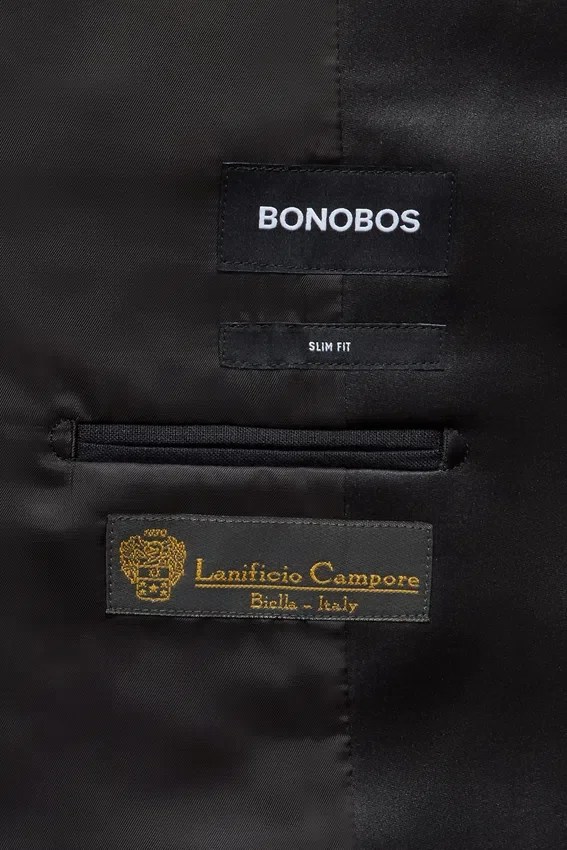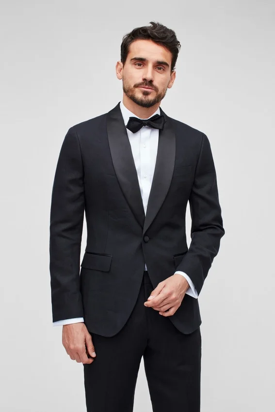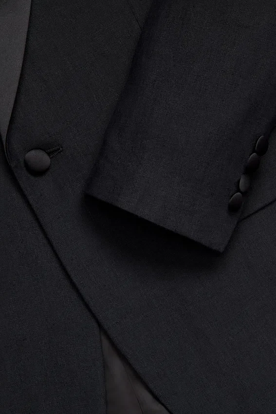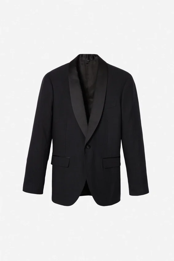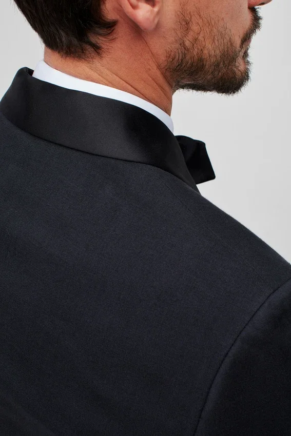 2-1/2″ Black Shawl Lapel | Fully Lined | Flap Pockets | Two-Button Single Breasted | Non-Functional Buttons at Cuff | Double Vent | Interior Welt Pockets