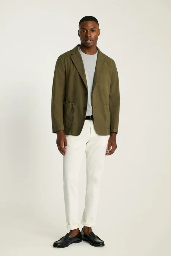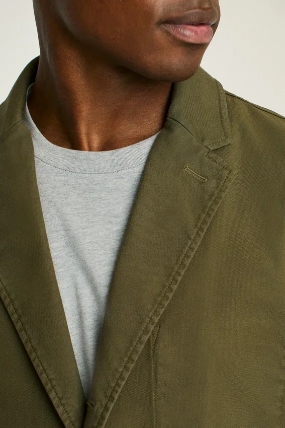 Notch Lapel | Three-Roll-Two-Button Stance | Completely Unlined and Unconstructed | Patch Pockets at Waist | Interior Pocket | Functional Cuff Buttons | Interior Locker Loop