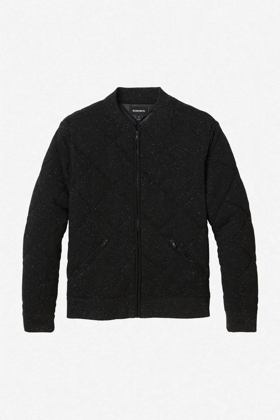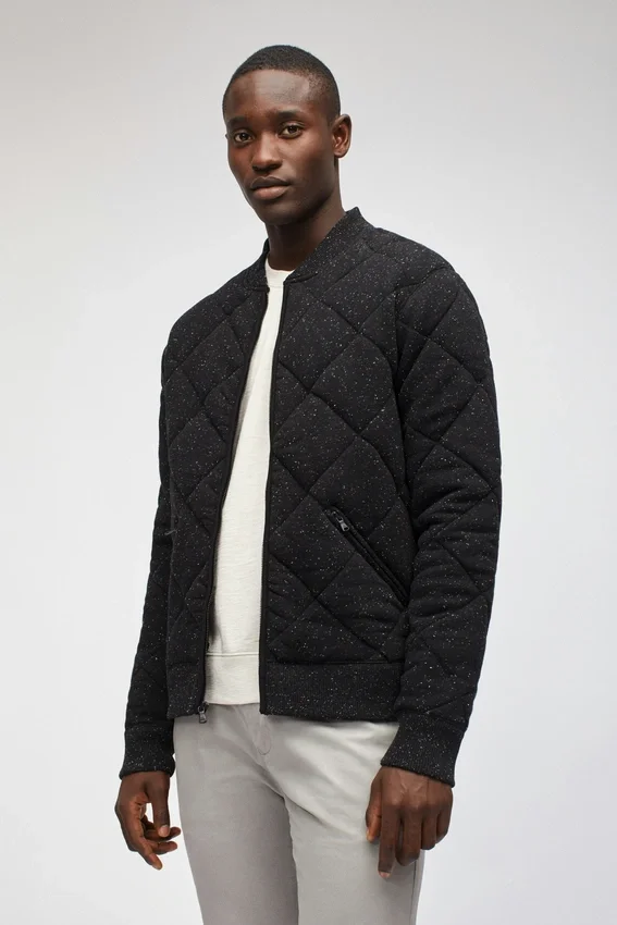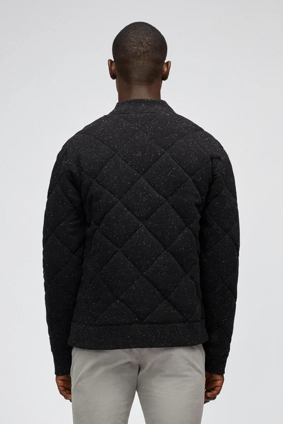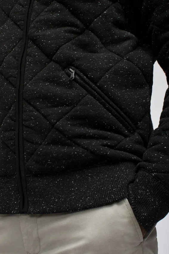 Warm and Quilted Black Donegal Jersey Fabric with Polyfill Filling | Zipper Entry Pockets W/ Oxidized Zipper at Center Opening
