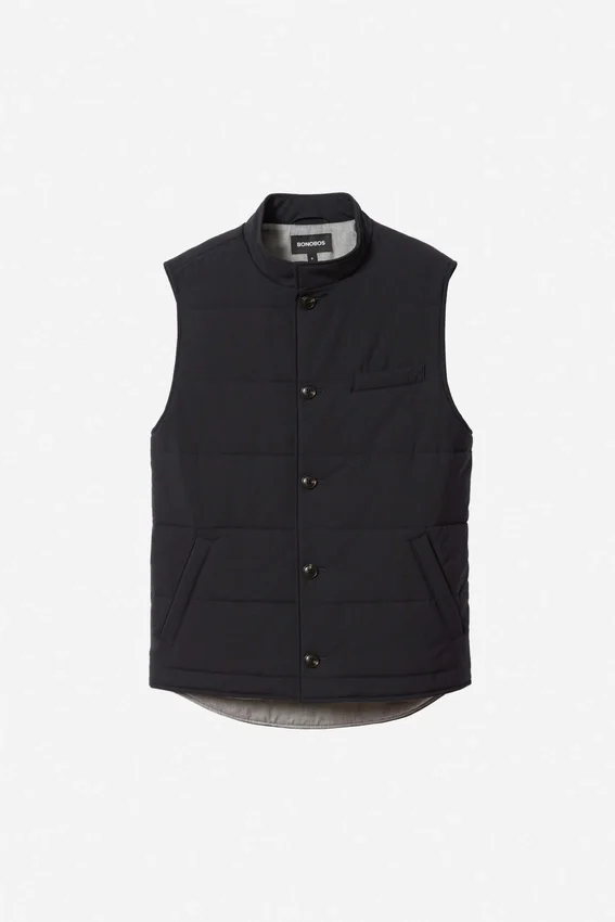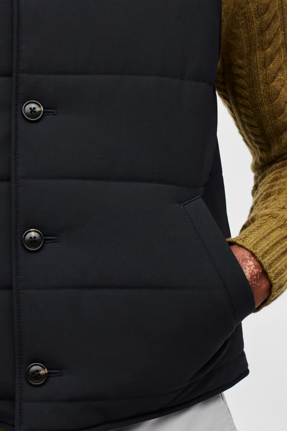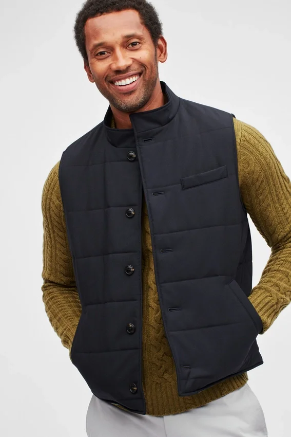 Italian Stretch Wool | Quilted and Filled for Warmth | Button-Front Closure | Fully Lined | Interior Pocket | Waist and Chest Pockets