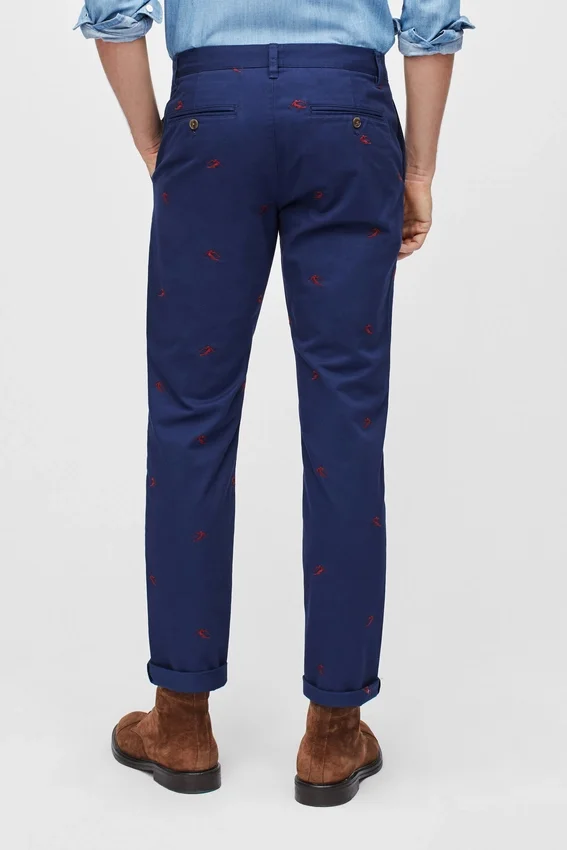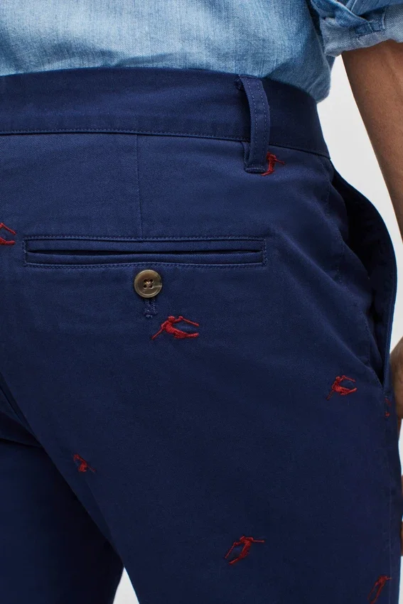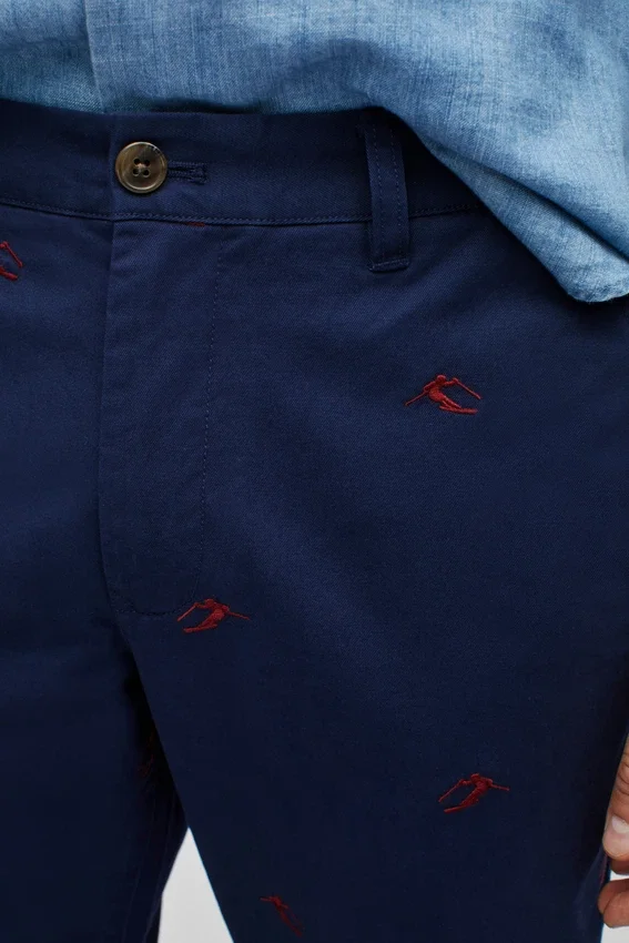 Seasonal Embroidered Motifs on Our Stretch Washed Chino Fabric | Signature Curved Waistband | Black Herringbone Pocketing | Italian Slide Snap Closure at Center Front | Zip Fly with Locking Zipper | Buttons at Back Pockets
