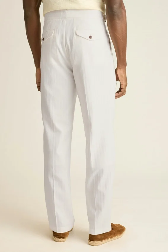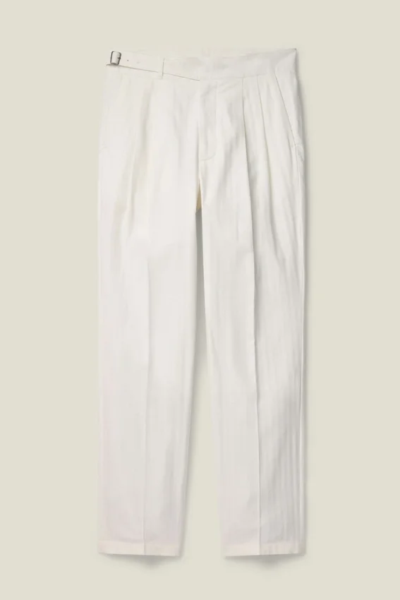 Cummerbund-Style Waist | Single Side-Tab Buckle for Customizable Wear | Back Flap Pockets | Double-Pleated Front | Slightly Higher Rise
