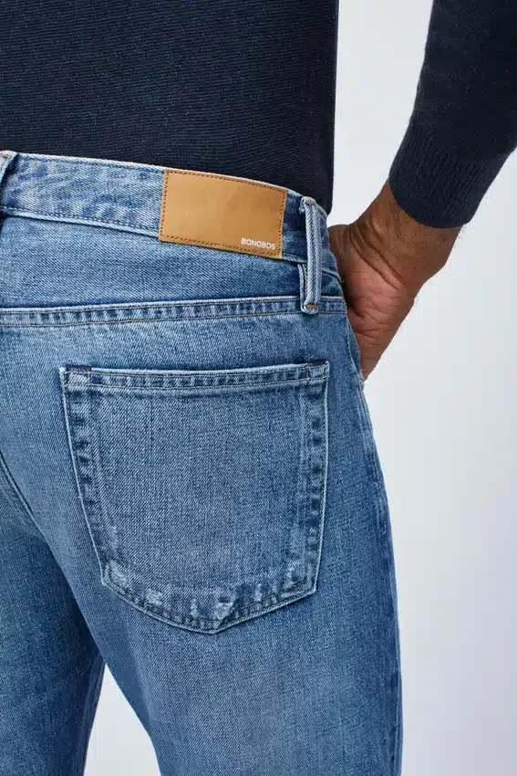 Classic Selvage Styling in 100% Organic Cotton | Made in America from Imported Fabric | Signature Curved Waistband with 5-Pocket Denim Styling | Selvage at Outseam and on Coin Pocket | Rivets at Pockets | Navy Leather Patch at Back Waistband with B Logo