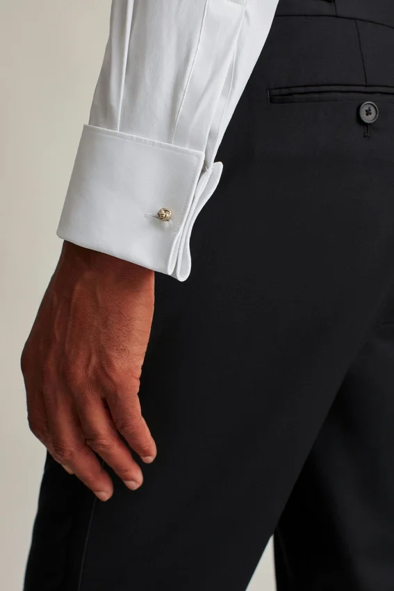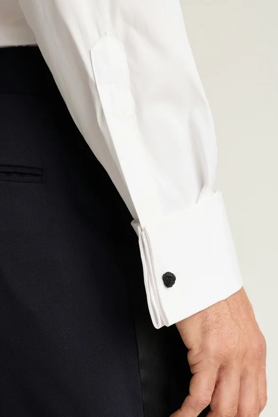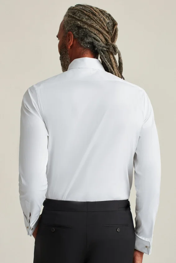 Our Finest Tuxedo Shirt Crafted with Mother-Of-Pearl Buttons and Split-Back Yoke! Designed with 78% Italian Cotton, 18% Polyamide, & 4% Elastane for Comfort and Durability!