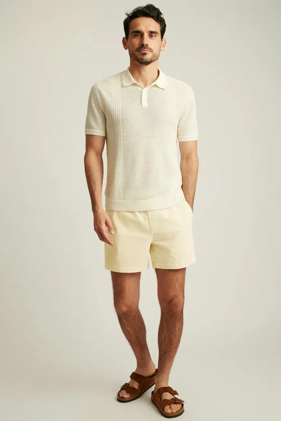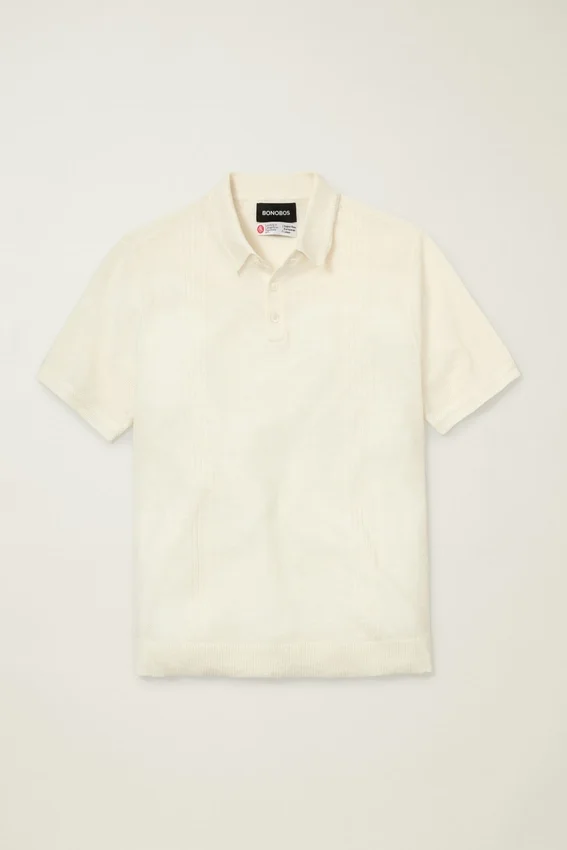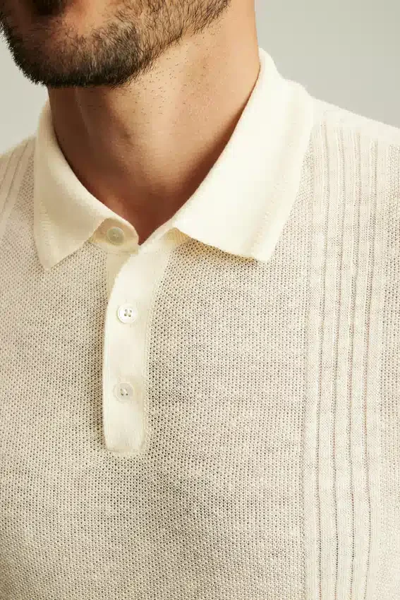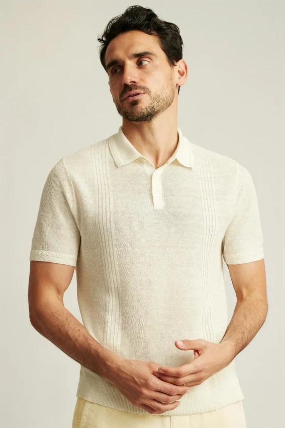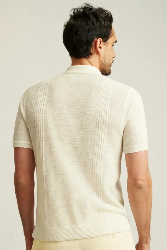 Lightweight 100% Linen Yarn in Polo Collar Body with Texture Stitch for a Casually Sophisticated Vibe. Zigzag Stitch Detail on Collar. Sustainability via Linen Fiber Content