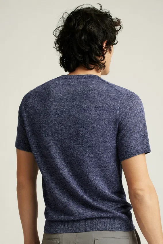 100% Linen | Three-Button Placket | Two-Color Marled Yarn | Lightweight Jersey Stitch | Zigzag Stitch Detail at Neck