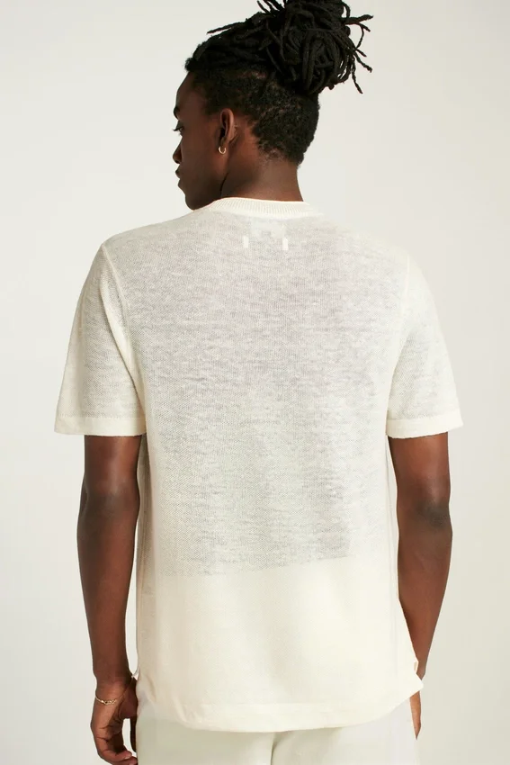 T-Shirt Silhouette in a Lightweight 100% Linen Yarn from an Italian Mill | Allover Texture Stitch for a Casually Sophisticated Vibe | Jersey Roll Detail at Collar | Sustainability via Linen Fiber Content
