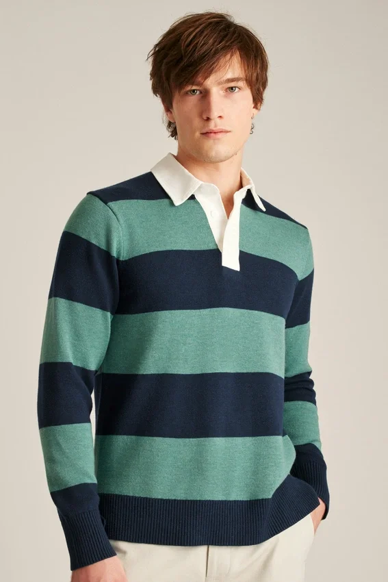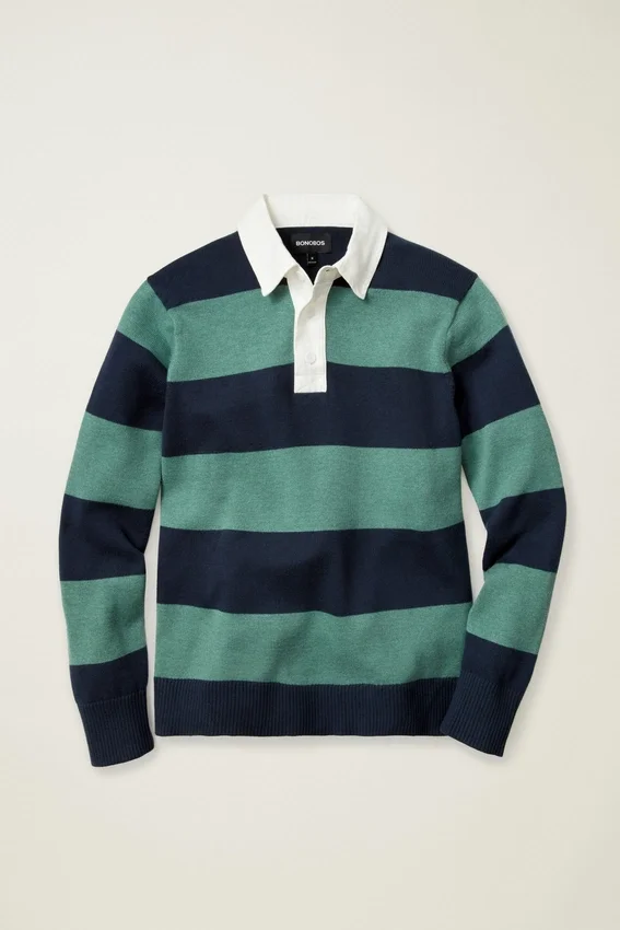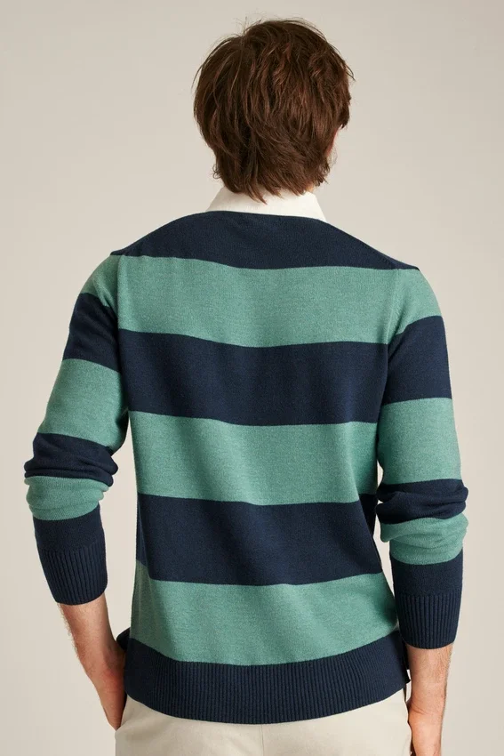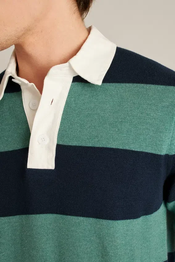Soft Cotton Yarn with a Touch of Wool for Warmth | Knitted in a Classic Yarn-Dye Rugby Stripe | Woven Twill Collar and Placket