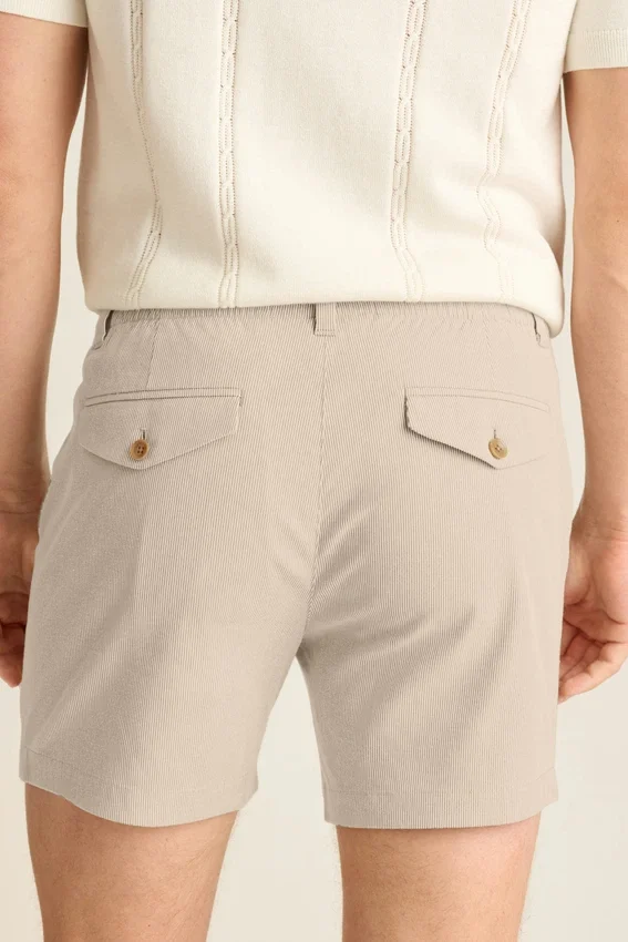 Flat Front Short with Elastication at Back Waistband | Back Welt Pockets with Button | Belt Loops | Back Pocket Flap Can Be Worn out or Tucked In