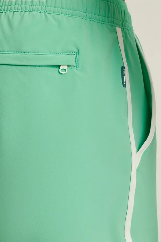 Vintage Surf-Inspired Curved Split Hem with Self-Binding and Placed Embroidery | Elastic Waistband with Interior Drawcord | Mesh Interior Lining | Front Pockets with Binding | Back Pocket with Zipper | Contrast at Interior Waistband and Key Catch