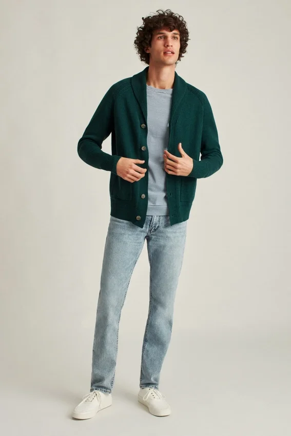 Model is 6’2″ with a 40″ Chest, and is Wearing a M in Slim Fit.