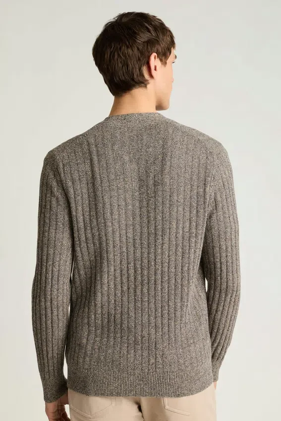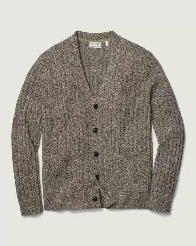 Italian Linen/Cotton Blend Yarn | Yarn is Twisted with Two Different Colors for a High-Low Effect | Fisherman Rib | Patch Pockets | Button Closure