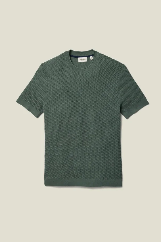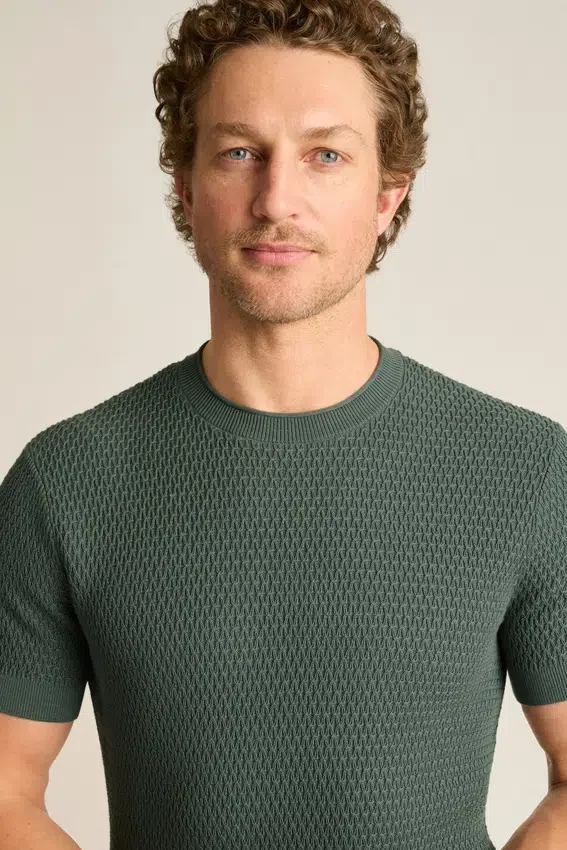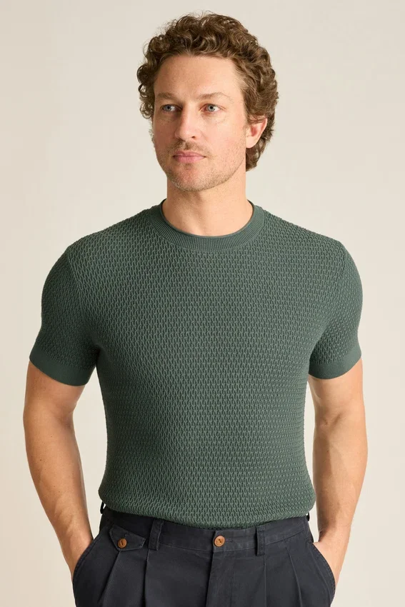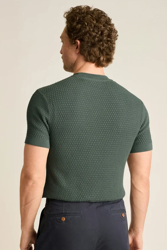 Soft and Breathable Cotton Yarn | Allover Texture Stitch | Crew Neck with Rolled Edge | Rib Trims | Short Sleeves | Lightweight
