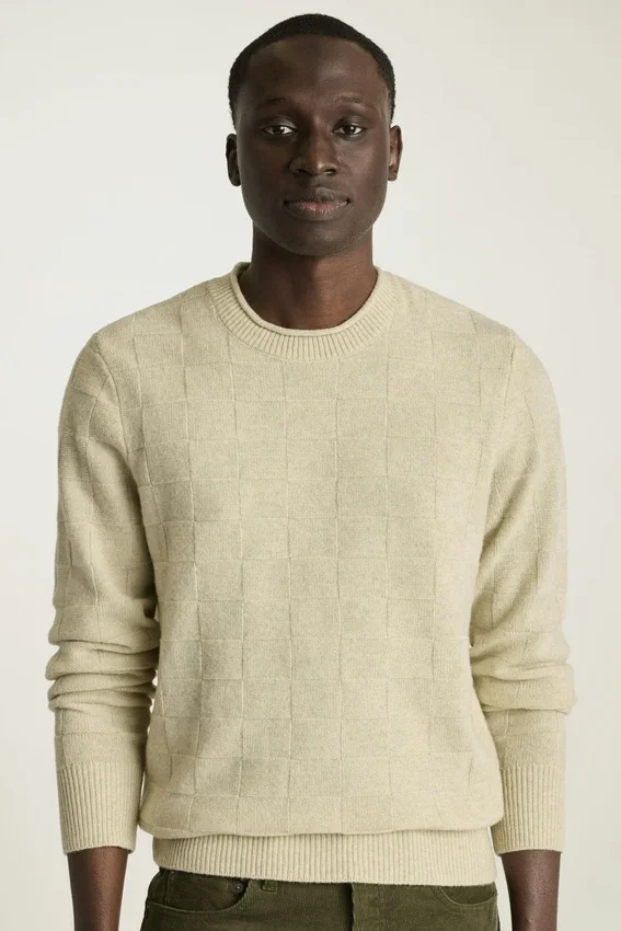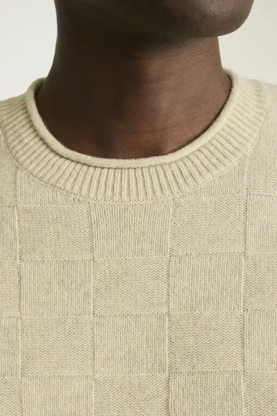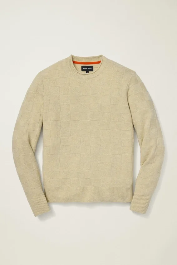 Merino Blend Yarn | Allover Grid Texture Stitch | Crew Neck with Rolled Edge | Ribbed Trims