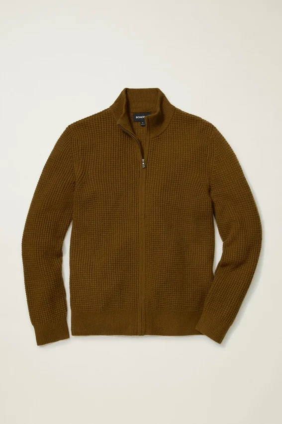 Soft and Cozy Blended Yarn with Allover Waffle Texture Stitch | Rib Trims | Full Zip Closure | Funnel Neck