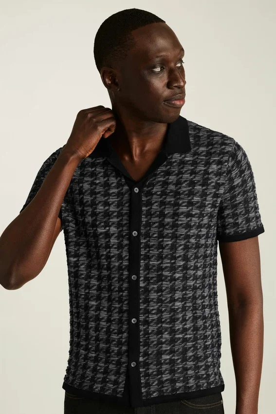 Soft and Breathable Cotton Yarn with Allover Texture Stitch Pattern for Sophisticated Retro Vibes. Can Be Worn Closed as a Shirt, or Open as a Layering Piece