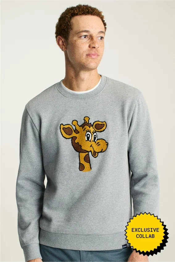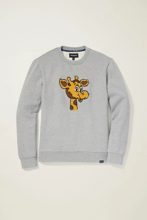 Soft Fleece with Chenille Embroidered Geoffrey | Toys”R”Us Kid Neck Tape | Bonobos X Toys”R”Us Woven Label at Hem (Flip Sweater Hem up to Read “I’m a Toys”R”Us Kid)