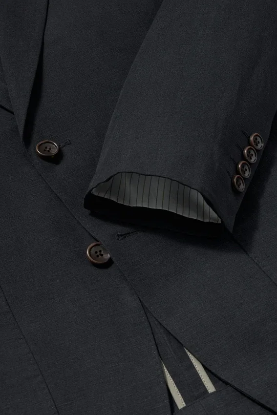 Fabric from Duemilagori Mill in Italy | Light, Uncanvassed Construction | Relaxed Fit |Peak Lapel | 2 Buttons at Front | Double Vent | Non-Functioning Button Cuffs for Easy Sleeve Tailoring | Interior is Partially Lined in Lightweight Cotton | Sleeve Lining
