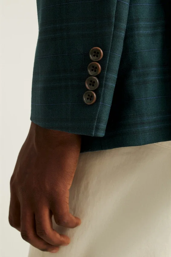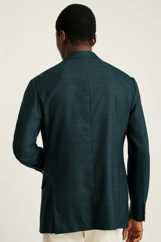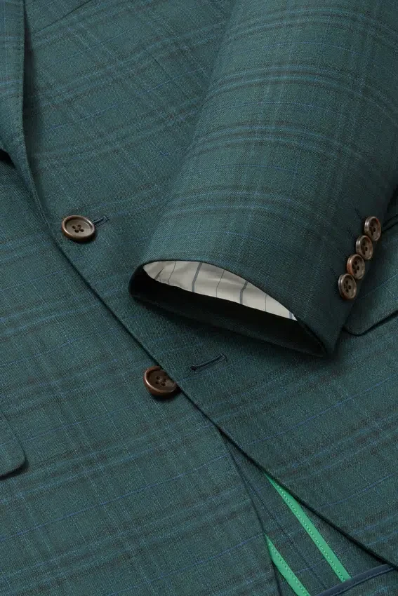 Jacket Features Modern 2-½” Lapels | Double-Button, Double-Vented with Contrast Piping and Non-Functioning Button Cuffs | Lined Only at Sleeves