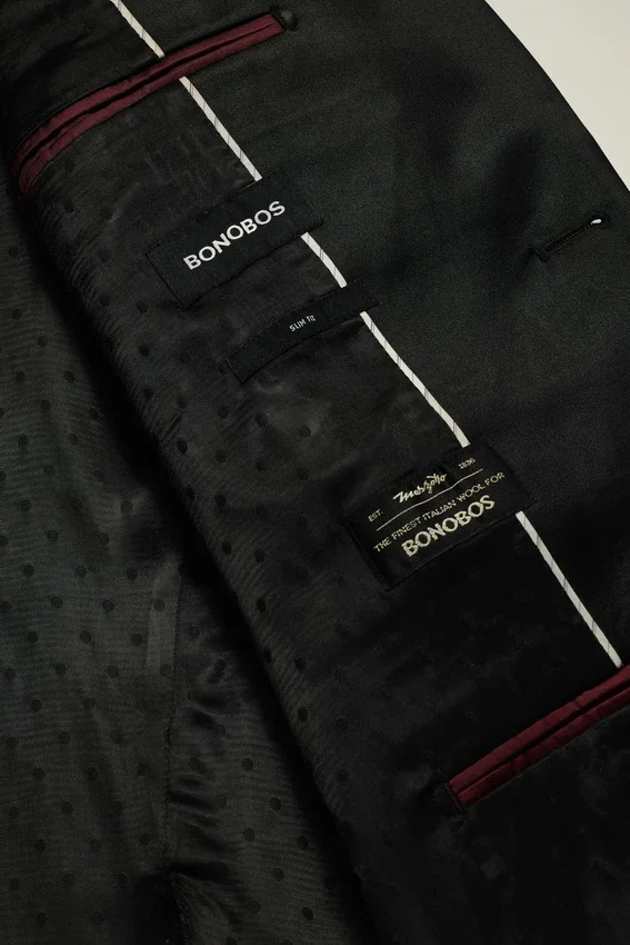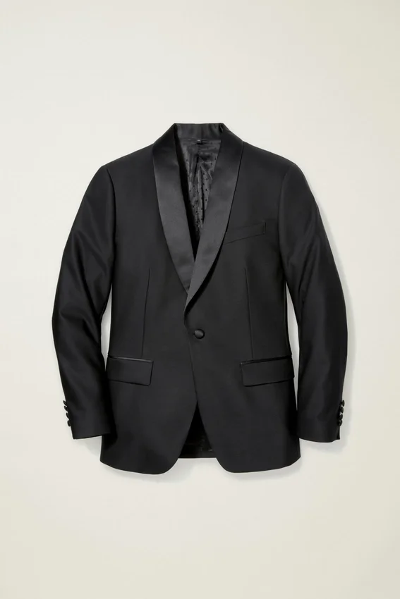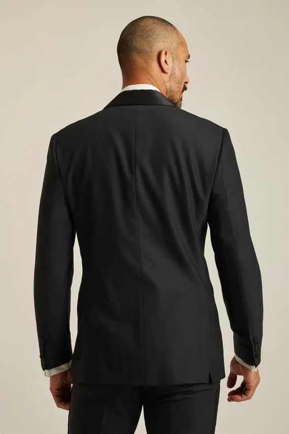 This Fully Lined Tux is Made in a Barethea Stretch Wool from Marzotto.| Contrast Satin Peak Lapel | Single Satin-Covered Button at Front | Flap Pockets | Fully Lined Interior with Jacquard Dot | Bemberg Sleeve Lining, Interior Pockets and Contrast Interior Piping | Back Vents