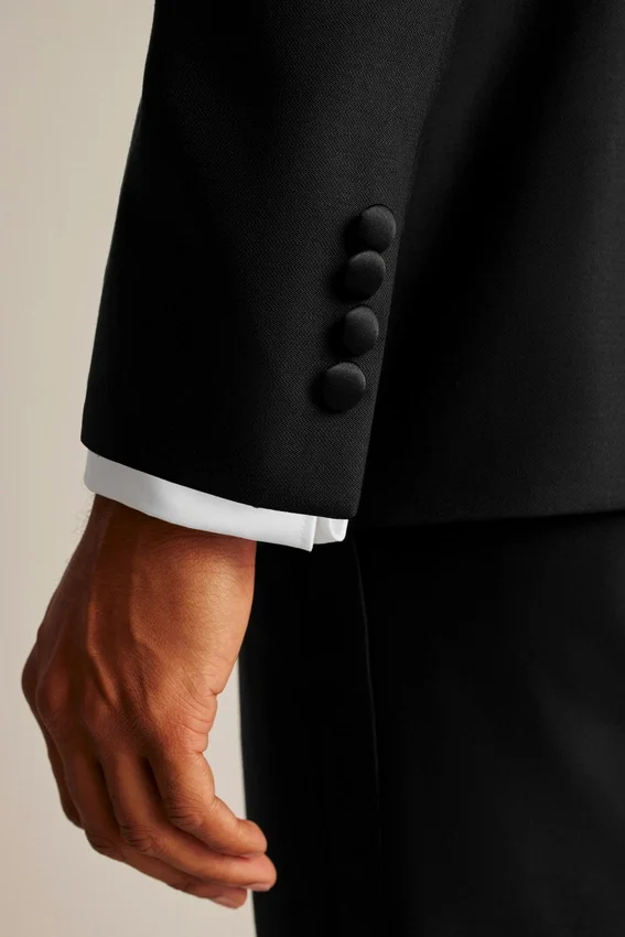 Contrast Satin Peak Lapel | Single Satin-Covered Button at Front | Flap Pockets | Fully Lined Interior with Jacquard Dot | Bemberg Sleeve Lining, Interior Pockets and Contrast Interior Piping | Back Vents