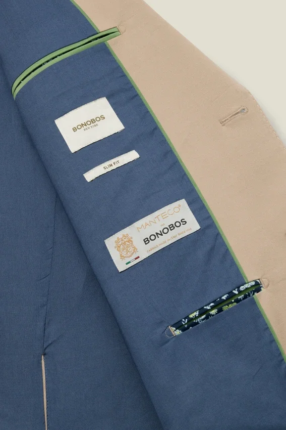 Fabric from Manteco | Half Canvassed Construction | Notch Lapel | 2 Buttons at Front | Double Vent | Non-Functioning Button Cuffs for Easy Sleeve Tailoring | Fully Lined Interior | Custom Bonobos Flower Embroidery at Interior | Custom Bonobos Print at Interior
