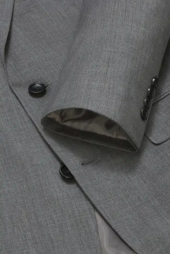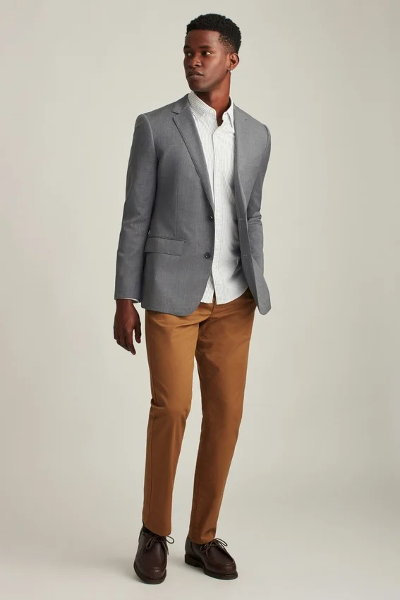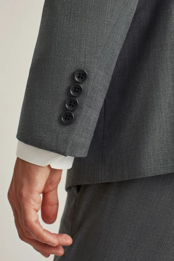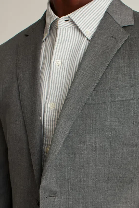 Fully Lined, Lightly Constructed Jacket | All-Season Wool Stretch Fabric | 3-1/4″ Lapel | Flap Pockets | Two-Button Single-Breasted | Fully Lined Interior | Sleeve Lining | Non-Functional Buttons at Cuffs | Double Vent | Interior Passport Pocket